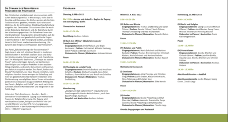 Nach dem thematischen Tagungsteil begann mit dem methodischen Austausch die zweite Hälfte der Tagung. In einzelnen Panels wurde über die Bedeutung von Gender, Emotionen und Generationen als spezifischer Forschungszugang diskutiert. Diese Zugänge wurden jeweils vor dem Hintergrund einzelner Projekte reflektiert und mit der Vorstellung ausgewählter Inhalte verknüpft. Im Podium Recht und Religion diskutierten die Panelisten das Verhältnis von Staat und Kirche, insbesondere mit Blick auf das deutsche Staatskirchenrecht.