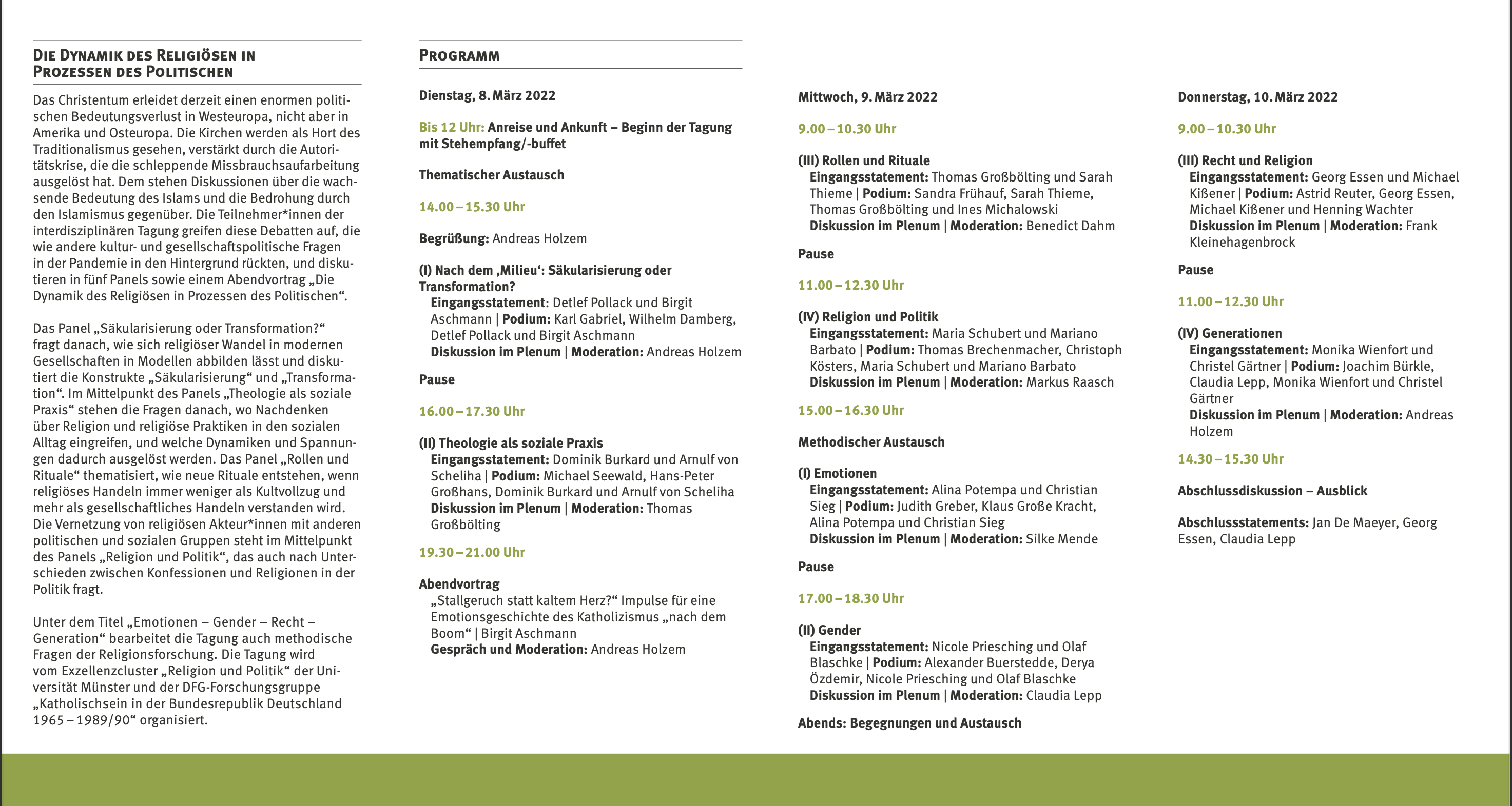 Im Gegensatz zu Amerika und Osteuropa sieht sich das Christentum in Westeuropa mit einem Bedeutungsverlust konfrontiert, der durch die Wahrnehmung der Kirchen als Refugium von Traditionalismus zementiert wird. Die Autoritätskrise, die durch die nur schleppend voranschreitende Missbrauchsaufarbeitung entstanden ist, verstärkt diesen Prozess. Die Corona-Pandemie hat seit nunmehr zwei Jahren viele andere gesellschafts- und kulturpolitische Debatten in den Hintergrund gedrängt. Das gilt auch für Fragen des sozialen Zusammenlebens, die beeinflusst werden durch die Praxis und Wahrnehmung von Religion. Diese Fragestellungen sind für die Mitglieder des Exzellenzclusters und der DFG-Forschungsgruppe von zentraler Bedeutung, sodass eine Tagung mit diesen Schwerpunkten zur passenden Zeit gekommen schien. Der erste Tagungsteil gliederte sich in inhaltliche Panels und einen Abendvortrag. Vor allem Aspekte des religiösen Wandels in modernen Gesellschaften, der Einfluss von Religion auf die soziale Lebenswirklichkeit oder die Vernetzung religiöser Akteur*innen mit politischen oder sozialen Gruppen wurden thematisiert.